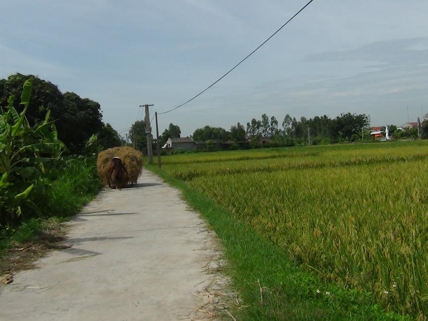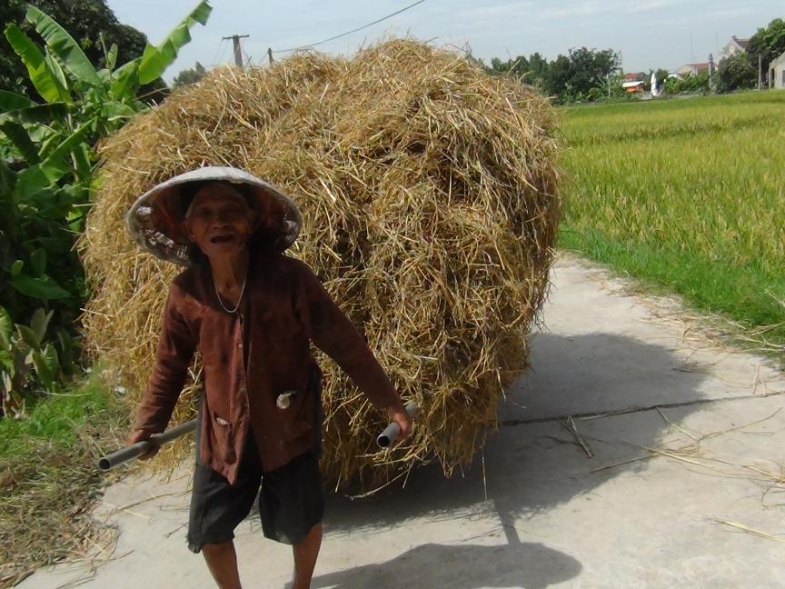 - Cụ tâm sự : Ông ấy cũng đi bộ đội, làm ở xã và lại đi thoát ly để làm cho nhà nước nhưng khi về đến nay chẳng có chế độ gì. Hai vợ chồng chỉ có chế độ đối với người đủ 80 tuổi theo quy định ... ; bà vẫn đi cấy, cuốc ruộng và chở xe rơm rạ như thế này .... ; nhưng tấm ảnh tôi chụp được lúc 9h 40 ngày 20-6-2014, trên đoạn đường dài 1,5 km từ ngoài đường nhựa chỗ tôi gặp cụ và đi vào trong thôn của cụ. Kính trọng cụ và cảm phục tình thần lao động của cụ, tôi xin chụp ảnh và mừng tuổi cụ 200.000đồng, chúc hai cụ luôn mạnh khỏe và hạnh phúc trong tình yêu thương của con cháu và sự kính trọng của nhân dân trong thôn và xã hội về ý chí lao động của cụ.