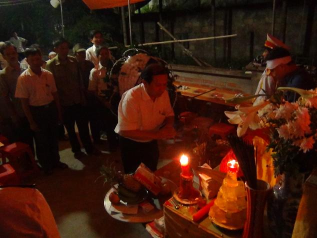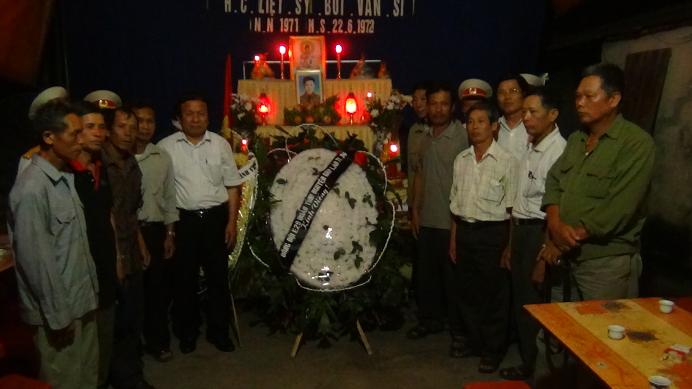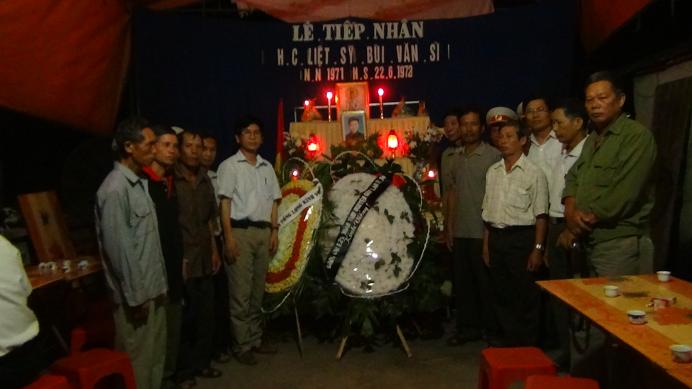 - 19h tôi nay 31-5-2013, chúng tôi ccb có 11 người là đồng đội của Sỹ thuộc đại đội pháo 23 ly và ở Ban Tham mưu trung đoàn bộ 29 bộ binh, quân tình nguyện giúp bạn Lào 1971 - 1974, quê huyện Nam Sách và huyện Kinh Môn, đặt vòng hoa trắng và hương hoa cùng đến viếng. Khi nhận được tin Sỹ đã được gia đình đưa về quê, đồng chí Tài đã thông báo cho tôi và anh em thống nhất làm vòng hoa trắng để 7h tối đến viếng. Thế rồi nhiều việc tôi đã quên không dặn vợ làm vòng hoa trắng mà làm vòng hoa nhiều màu. Tôi và đồng chí Nguyễn Thành Long đi từ thành phố Hải Dương xuống Kinh Môn đi qua Phà Tuần Mây, đến gần bên kia sông mới nhớ ra là phải mang vòng hoa trắng, vì Sỹ hy sinh khi 19 tuổi, chưa có vợ. Thế là xe quay đầu ngày trên phà và trở về Hải Dương làm lại vòng hoa màu trắng. Đến gia đình người em trai, nghi thức tang lễ của địa phương đối với người có công và các liệt sỹ rất trang trọng, nhưng tất cả chỉ có vòng hoa của đoàn chúng tôi là vòng hoa trắng. Trên khung ảnh thờ, Sỹ mãi mãi trẻ trung tuổi 20. Chúng tôi buồn vì Sỹ hy sinh còn trẻ quá, hơn 40 năm mới về được quê hương của mẹ, nơi sinh ra và nuôi dưỡng Sỹ mãi ở tuổi 20 và cũng tự hào người bạn, người đồng đội đã hy sinh thay cho bạn mình, Sỹ xung phong đi làm nhiệm vụ buổi tối ngày 22-6-1972, đó là một buổi tối định mệnh, rồi Sỹ đã hy sinh vì tổ quốc, vì nghĩa vụ quốc tế cao cả !